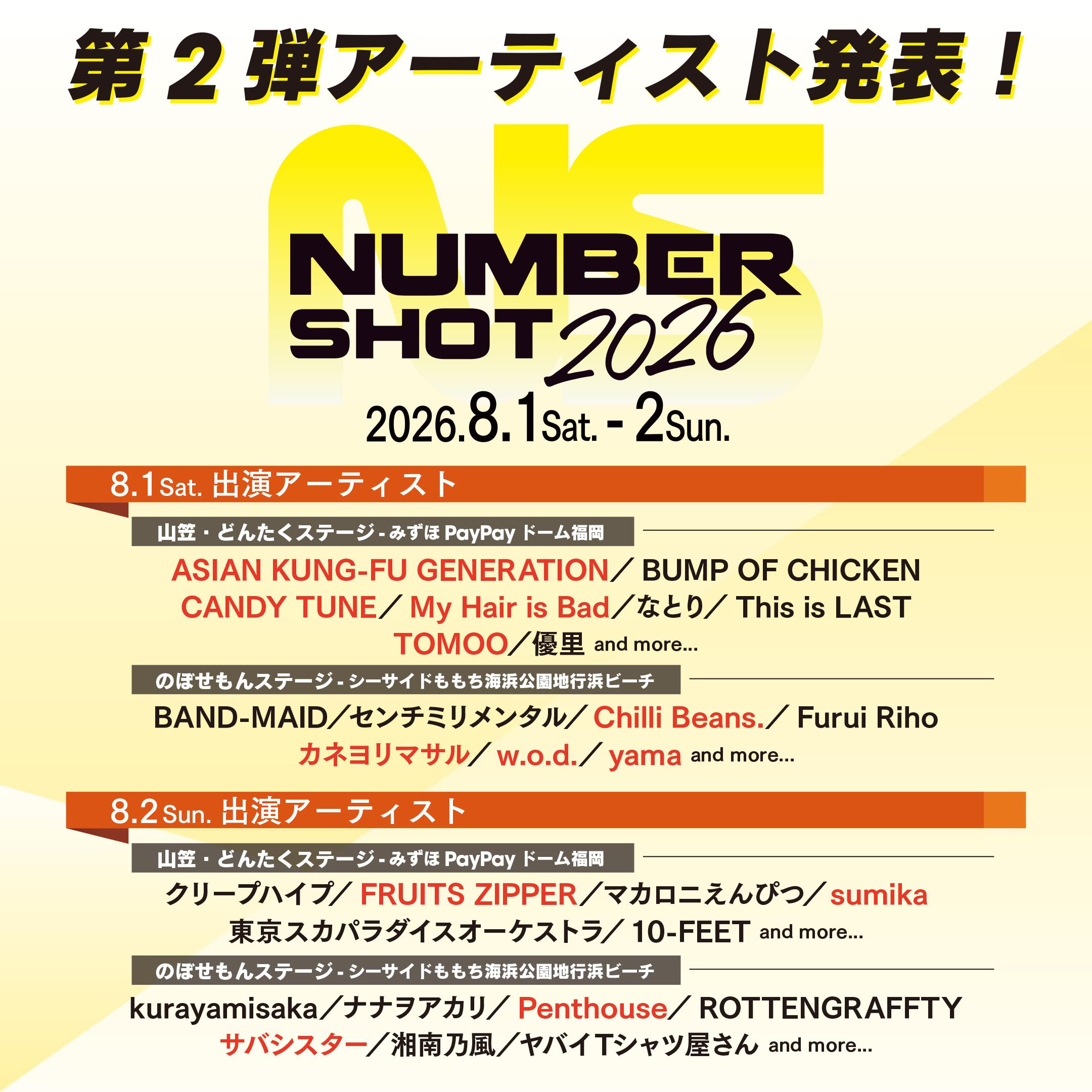 2026年8月1日(土)、8月2日(日)みずほPayPayドーム福岡 / シーサイドももち海浜公園地行浜ビーチにて開催されるNUMBER SHOT2026にChilli Beans.の出演が決定!